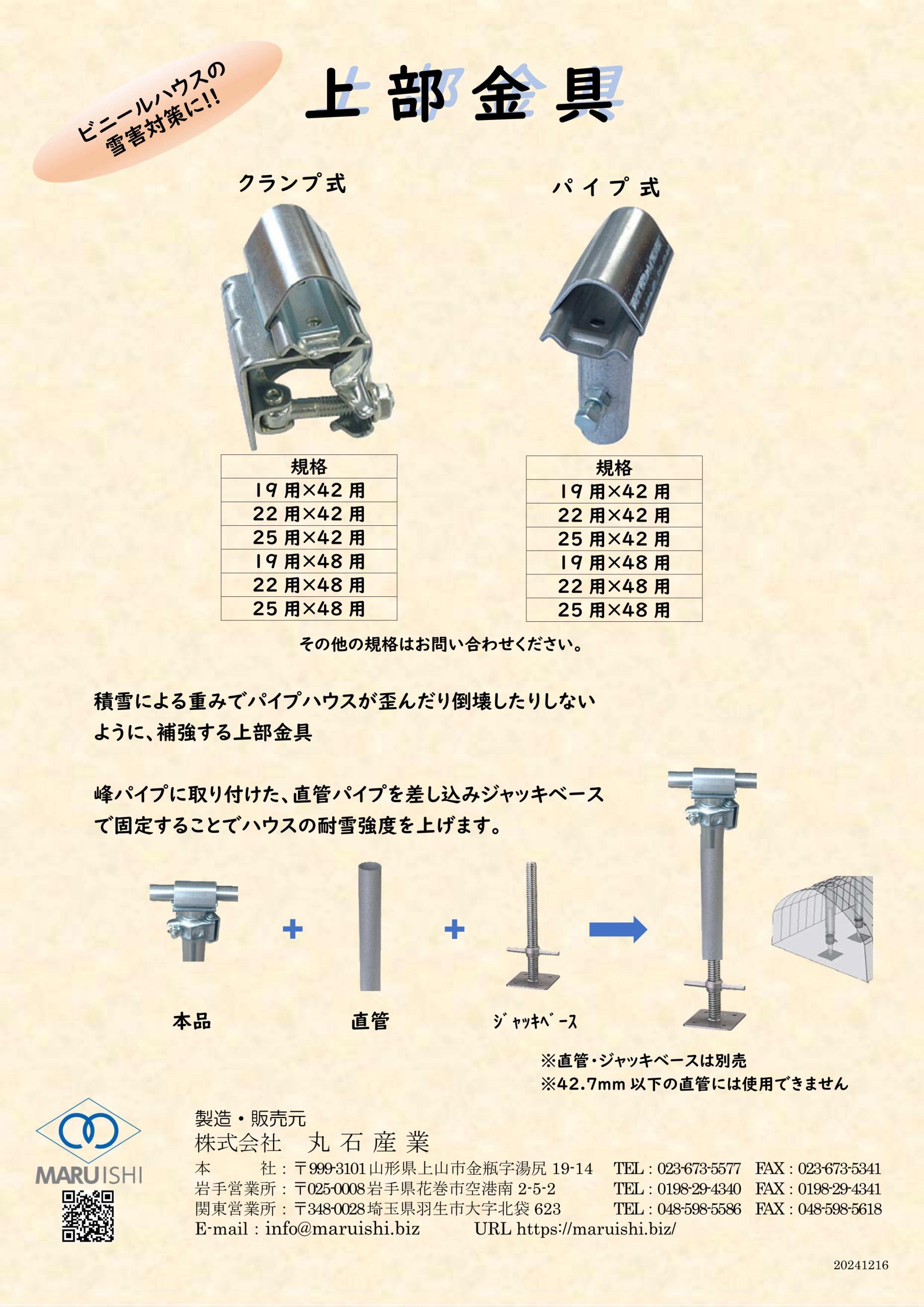 2026.02.25 < 雪・強風対策 > 上部金具 今年は東北以外の地域でも雪の予報が続き、 < 雪・強風対策 >として上部金具に関するお問合せが続きました。 ご質問もいただいたため、改めて規格の一部ではございますがチラシを作成しました。 また、実際に工夫してご利用いただいている方々の使用例はSNSにて紹介しております。 大切なビニールハウスへ 参考にしていただければ幸いです。
